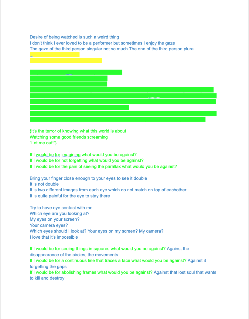 Setareh’s current practice involves creating trans-local collaborations, gathering of ghostly presences and avatars and lowering the opacity of projections and frames. Staying with Parallax as an ability to see (and imagine) two or more images at once, a feeling of absence which can suggest the possibility of the multiplicity of presences in the room, is the way she addresses the issues around body restrictions to move and migrate and the post-pandemic terms like SCREENtime and videocallFatigue.